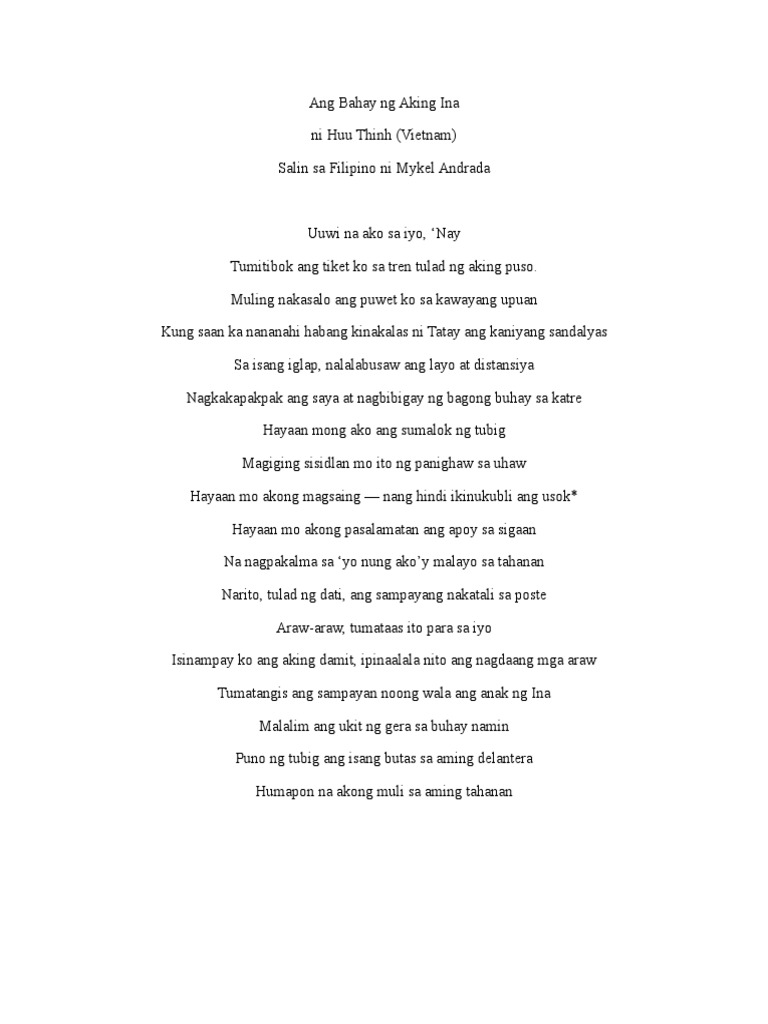 Sa isang mag-anak ay meron pa kaya Na sa amat inay higit pang dakila Na kahit sa angkang mahirap nagmula Ang para sa anak lahat ay ginawa. Talata Aking Ina Ang Essay Sa Tungkol. Inalagaan ang aking lolo.