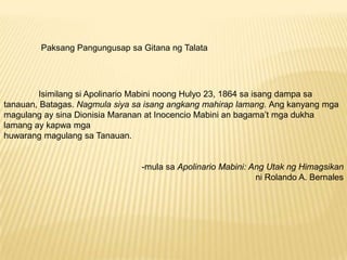 Panimulang Talata Ito ay nagsasaadPanimulang Talata Ito ay nagsasaad ngng paksa at layuninpaksa at layunin ng isangng isang pagpapahayag sa isang malinaw napagpapahayag sa isang malinaw na paraanparaan. Ang isang maikling talata ay binubuo ng dalawa o tatlong pangungusap lang. Kung mayroon mang nakarating na sa tagumpay at tumalikod sa kanyang kapwa at pinagmulan masasabing siya ay isang walang utang na loob.