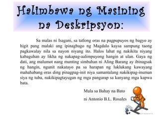 Masininh na paglalarawan talata. Halimbawa ng mga Tagalog na Tula Maikling Tagalog na Tula. Essays Na Ng Masining Paglalarawan Halimbawa The economic and political statues were included as well. Halimbawa Ng Karaniwang Paglalarawan Free Essays.