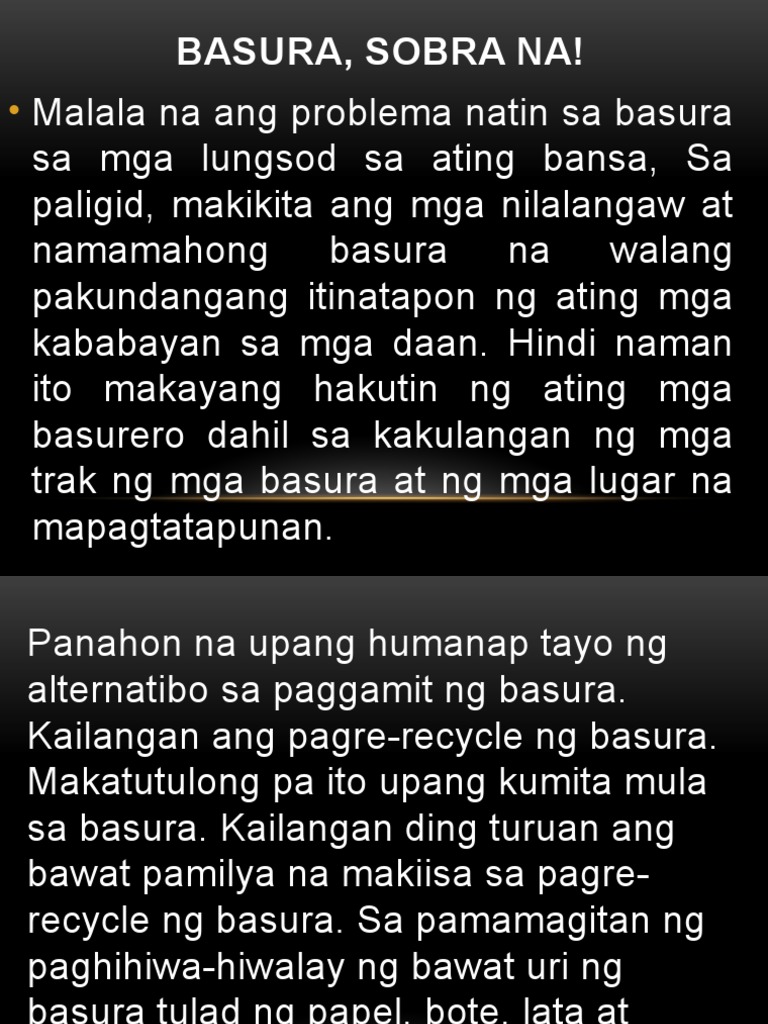 Talumpati tungkol sa isyung basura - 2377439 wafs wafs 09092019 Filipino. Ito ay maaaring maging sanhi ng pagbara ng mga kanal mula sa lansangan kung patuloy na itatapon ang mga basura. At naiiba pa ang kanilang kasootan yun bang tinatawag nating Maria Klara ikanga.