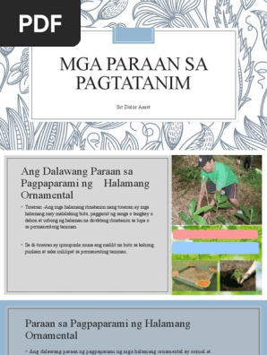 Sanaysay tungkol sa pagtatanim. Pakinabang sa pagtatanim ng Halamang Ornamental Nilalaman. Ihanda ang mga gagamiting kasangkapan at. Pagtatanim Pagpaplano sa Pahahalaman Uri ng lupa Pagkukunan ng tubig Sikat ng araw Layo ng halamang gulay sa mga puno at iba pang halaman Sariwang hangin.