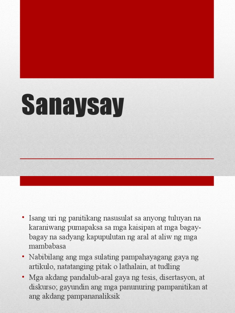 Ang sanaysay ay isang uri ng panitikang nasusulat sa anyong tuluyan na karaniwang pumapaka sa mga kaisipan at mga bagay-bagay na sadyang kapupulutan ng aral at aliw ng mga. Parang bituin sa langit ang ningning ng kanyang mga mata. Tauhan Sa anekdota kailangang ang pangunahing tauhan ay isang kilalang tao.